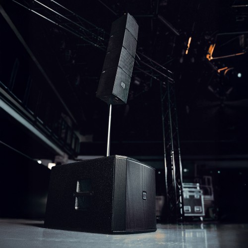 SUB 15 P unterstützt Ground-Stack-Konfigurationen mit bis zu drei Einheiten. Mithilfe der Andockplatte auf der Oberseite kann eine M20-Distanzstange oder ein MAILA COL direkt am Subwoofer befestigt werden.