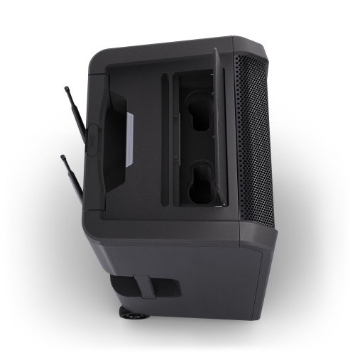 Thanks to the integrated wheels and extendable telescopic handle, the speaker can be pulled around comfortably like a trolley.